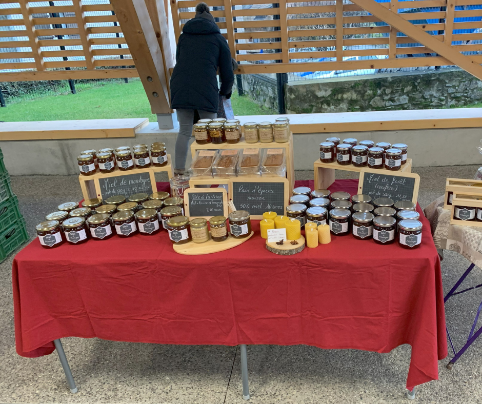 Il propose son miel de montagne ainsi que divers produits apicoles : pain d’épices maison, nougat tendre maison, mélange miel et noix, coffrets cadeaux et bougies.